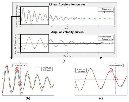 These results express low errors in terms of oscillation timings and amplitudes disparities for linear acceleration and angular velocity data. In fact, the similarity between the experimental and theoretical data is visible in Figure 10. Consequently, we can successfully validate and have confidence in the inertial data provided by the device.
