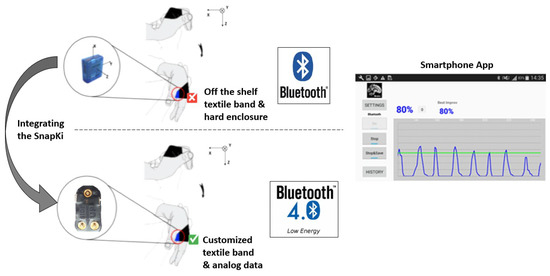 This paper is divided in four main sections. In Section 2, the SnapKi wearable health device and its surrounding system is presented, that is, all details regarding hardware and firmware development, textile adaptation and sensors calibration and validation are explained. Section 3 introduces the adaptation of the SnapKi to the iHandU system. Here, the modifications of the textile band and the production of the force sensors are described. Furthermore, the results obtained from a comparison between the previous iHandU system hardware and the SnapKi are presented. Section 4 illustrates the conclusions to retrieve from this project and some future directions.