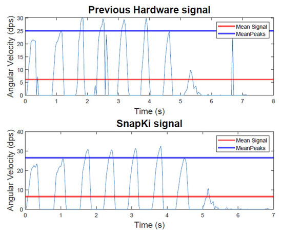 From Figure 14 it is certain that the two signals are very similar. However, the results show a slightly difference between the angular velocity data obtained with the previous hardware and the SnapKi. This difference is related with the fact that the SnapKi is capable of obtaining detailed data. In addition, since the SnapKi acquires data at a higher frequency than the previous hardware, it is possible to conclude that it allows for the collection of more accurate data.