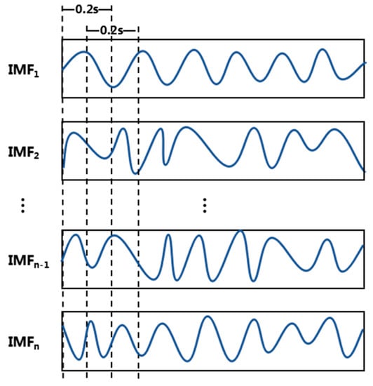 (1) Feature extraction. Since the inputs of these three classifiers cannot be original time series data, it is necessary to segment the IMFs signal first and extract the features of each segment. During segmentation, we use a sliding window to slice the data into 0.2 s, and 50% overlap each slice front and back, as shown in Figure 2, (the front and back windows are shown by the dotted lines in the figure have a 0.1 s overlap).