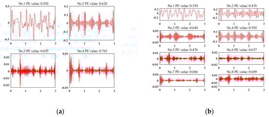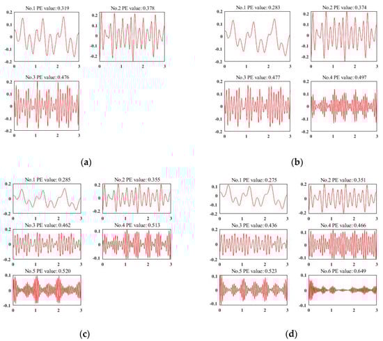 We also compare our VMD method to another famous signal decomposition method [62], called wavelet packet decomposition (WPD). Figure 5a,b presents the decomposition results by WPD when the decomposition level is 2 and 3, respectively. When K = 2, only the first decomposition result is valid (the value of permutation entropy is less than the threshold 0.6). Also, when K = 3, the valid decomposition result is less than that of VMD. VMD can perform better even if the decomposed number K is not suitable for decomposition.