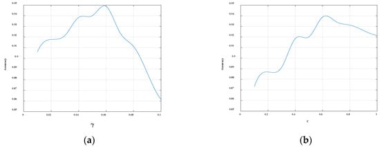 In order to optimize the final SVM model, we conduct the grid search to find the optimal SVM training parameters. In SVM, the two main parameters that need to be determined are C and γ, where the C is the penalty coefficient. If C becomes larger, it means that the punishment becomes larger, resulting in a situation where the model is not flexible enough and the generalization ability becomes weak. Conversely, if it becomes smaller, the punishment strength will become smaller, and the model is prone to underfitting. Another parameter γ determines the distribution of the data mapped to the new feature space. Similar to parameter C, γ that is too large will cause the model not to learn the content of the vector, but only remember the support vector itself, which leads to the reduction of generalization ability and prone to overfitting. If is too small, the data distribution in the new feature space will be too smooth, resulting in underfitting. In this paper, the classification threshold θ is set to 0.5, the SVM convergence coefficient is fixed at 0.01, and the parameter γ is fixed at 0.01. The changes in the parameters and the final classification accuracy of the model are shown in Figure 6. The classification effect is the best when the value of the parameter C is 0.6. Similarly, when the SVM convergence coefficient is fixed at 0.01 and the parameter C is fixed at 0.6, the changes in the parameters and the final classification accuracy of the model are shown in Figure 6. It can be seen from the figure that when the value of the parameter γ is 0.06, the classification effect is the best. In summary, C = 0.6 and γ = 0.06 are used in this paper.