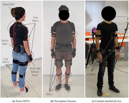 Finally, the custom device, described in References [,], is composed of 11 IMUs, attached to the upper arms, lower arms, upper legs, lower legs, pelvis, head and T1 vertebra, that allows reconstructing the movement of the whole body except the wrist joint. In Figure 3c a setup with four units worn by a volunteer is presented. The data can be transmitted via Wi-Fi to an external unit at 100 Hz and thanks to the server specifically developed the data can be saved together with the timecode. For this device, as presented in Reference [], a calibration algorithm, an anatomic variables estimation, and a reconstruction of the IMUs motions are developed. The calibration algorithm involves a first step where the user must rest in N-pose (neutral pose in which the person is standing with the arm relaxed to each side of the body and the thumbs point forward) and then joining his/her hands. This procedure allows estimating the sensor pose and the limbs’ lengths thanks to a Kalman Unscented filter. This is the less robust device of the three motion capture systems.