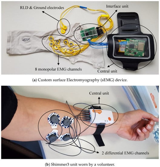 Regarding the EMG systems, we compared a custom and a commercial device, that is, the Shimmer3 EMG. The first having better performances, but the latter being more robust. The custom device (Figure 4a), an evolution of the device presented in Reference [], is able to monitor the effort level of the operator’s arms employing eight monopolar sEMG signal channels and an onboard filtering algorithm. Besides, the signals can be monitored in real-time on an external unit thanks to the software specifically developed that wireless (Wi-Fi) receives the EMG data together with the timecode. The system is composed of 2 main units: the central unit, which contains the battery charge circuit and handles the Wi-Fi protocol; and the interface unit that deals with the acquisition of the analog signals with a pre-filtering stage. This stage is composed by two filters: a low-pass filter with a cut-off frequency of 96.7 rad/s to filter out the Electromagnetic Interferences (EMIs); and a sinc filter, implemented inside the Analog to Digital Converter (ADC), to remove the aliasing due to the decimation when the acquisition frequency is reduced. The distinction between the two hardware units allows minimizing electrical interference during signal acquisition. The EMG signal channels are complemented by two other electrodes: one for the Right Leg Driving (RLD) circuit to reduce the common-mode interference, and one for the reference. The device has technical specifications (Table 2) comparable to commercial systems, it has a common-mode rejection ratio (CMRR) of −115 dB, a Signal to Noise Ratio (SNR) between 15 and 16 dB, a resolution of 24 bits, a maximum acquisition frequency of 32 kHz, a gain of 1 to 12, and the small dimensions and weight makes it comfortable and easy to wear. This device is a new version of the one presented in Reference [] where there was no distinction between the central and the interface unit, the sEMG channels were 32, the wireless communication was via Bluetooth.