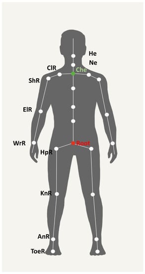 Kinematic chain used for motion reconstruction. Centres of the spherical joints coincide with the origins of the frame attached to the child link following a hierarchical structure rooted in the waist. The names of these origins for some relevant frames are reported. Only the right side of the human body has been reported for symmetric links. The listed joints refer to: root (Root), chest (Che), neck (Ne), head (He), collar (Cl), shoulder (Sh), elbow (El), wrist (Wr), hip (Hp), knee (Kn), ankle (An) and toe (Toe)