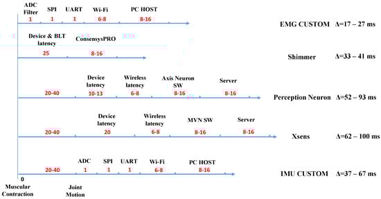 Comparison between the devices latencies. Listed below there are the acronyms used: Analog to Digital Converter (ADC), Serial Peripheral Interface (SPI), Universal Asynchronous Receiver Transmitter (UART), Bluetooth (BLT) and Moven Software (MVN SW).