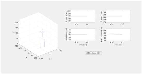 This paper refers to four suggested methods—the NIOSH LI (National Institute of Occupational Safety and Health Lifting Index) index for the ISO 11228-1 [], the Snook & Ciriello method for the ISO 11228-2 [], and the REBA (Rapid Entire Body Assessment) [] and the SI (Strain Index) [] for the ISO 11228-3. Whereas the NIOSH LI and the Snook & Ciriello methods are the golden standards for the respective sections, the methods adopted for the ISO 11228-3 are not the preferred one, and they have been chosen instead of the golden standard method (OCRA) because of the presence of activities with moderate loads and because they are better suited for automatization of the score calculation. Human posture and muscular acivation provide fundamental information for the implementation of NIOSH, Snook & Ciriello, REBA, and Strain Index ergonomic assessment methods. The NIOSH standard requires the computation of the maximum vertical and horizontal displacements, the initial lifting height, and the angular displacement of the trunk. Moreover, the method requires an estimation of the actions’ frequency. All these variables can be automatically determined as described in Section 3.5. Similarly, the Snook & Ciriello method requires the load-displacement and the actions’ frequency. Thanks to the data about reference displacement, hands height, and frequencies obtained from time analyses the Snook & Ciriello methods can be implemented. For an accurate application of the REBA standard, upper and lower body’s anatomical joint angles must be produced to evaluate posture. This standard considers trunk, shoulders, elbows, wrists, head, knees joints. Besides, the frequency of activities, the class of the load applied to the upper limbs, as well as the grip quality needs to be estimated for the evaluation. The strain index is a method of analyzing works for the risk of distal upper limb disorders. This method requires six variables that include an evaluation of the intensity, duration and frequency of effort, as well as the wrist posture and the speed of work. EMG and motion data are used to compute most of these variables.
