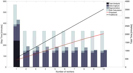 The time needed to perform a complete evaluation of the working activity of one worker has a large impact on the number of workers that can be considered in the evaluation of the activity. Therefore, for the assessment of the proposed method, the total evaluation time will be considered in addition to the correctness of the risk score. In particular, this section proposes a general, approximate comparison of the time needed to complete the evaluation of n workers with a traditional, purely observational method and the proposed one.