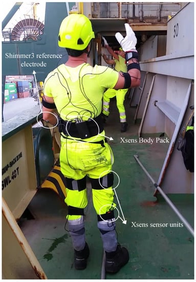 A volunteer ready to start his work shift wearing the wearable devices. The sensor units have been placed on the body segments as described in Section 3.4.1.