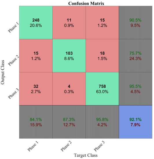 Multi-Layer Perceptron (MLP) Neural Network performance. The rows refer to the predicted class (Output Class) and the columns correspond to the true class (Target Class). The last column represents the percentages of all inputs correctly and incorrectly predicted for each class in green and red respectively. The last row represents the percentages relative to the target class that are correctly and incorrectly classified in green and red respectively. In the inner 3×3 square, the diagonal cells green squares correspond to correctly classified inputs, the other cells (red squares), to incorrecly classified inputs. The black numbers and percentages refer to the number of elements for each class and their percentage over the total dataset for the network test. The overall accuracy is reported in the lowest and rightest cell.