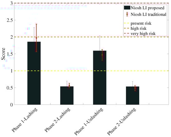 The offline data processing favours the intra and inter subjects analysis showing the mean value and the variability during the entire working sessions. The manual evaluation has obtained the following NIOSH LI and REBA scores: for lashing, in phase 1, in phase 2 and in phase 3; for unlashing in phase 1 and in phase 2 and in phase 3. These results are reported along with the proposed method scores to ease their comparison. Figure 12 shows the NIOSH score obtained through either automatic or traditional evaluation during workers lashing and unlashing activities.
