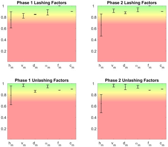 Factors that determines the Lifting Index in the two phases of Lashing and Unlashing operations. The background colors indicate the average factor values that, under the assumption , would produce a LI score corresponding to low (green), high (yellow t orange) and very high (red) risk.