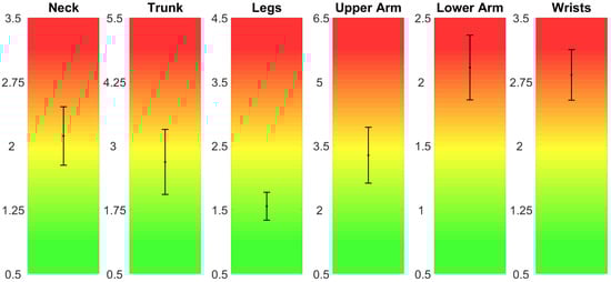 In addition to the aggregate scores, the proposed system allows to highlight the factors that determine the result. Figure 13 shows the multiplier factors and their variability. Similarly to the NIOSH LI, the systems allows the rater to analyze more in depth the outcome of the REBA score. Figure 14 shows the scores of the REBA method related to the postural factors, that is, steps 1, 2, 3, 7, 8, 9, related to neck, trunk, legs, upper arms, lower arms, and wrists respectively.