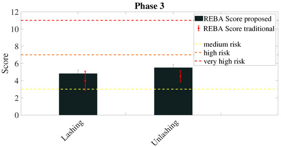 REBA score for lashing and unlashing in phase 3. The black columns represent the average and the standard deviation of the REBA score with the proposed method. The average scores and their standard deviations obtained through the manual evaluation are represented in red. The three horizontal dashed lines represent the different risk thresholds: a medium risk in yellow, a high risk in orange and very high risk in red.