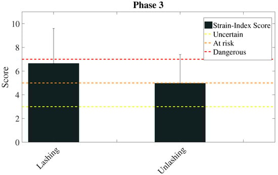 Strain Index score for lashing and unlashing in phase 3. The black columns represent the average and the standard deviation of the SI score with the proposed method. Three horizontal dashed lines represent the different risk thresholds: a low risk in yellow, a high risk in orange and very high risk in red.