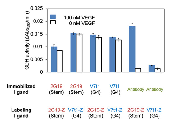 For electrochemical detection of VEGF, we selected a sandwich manner of detection. Therefore, first, the best combination of ligands was investigated on a sandwich plate assay. For this comparison, we chose two types of VEGF binding aptamers (Supplementary Materials Table S1). Both aptamers have a single binding region against VEGF with a nano-molar order Kd value, but fold into different unique structures. Moreover, 2G19 aptamer is predicted to form a stem loop structure [36], whereas V7t1 aptamer was revealed to form a G-quadruplex (G4) structure [37,38]. To label them by ZF-GDH, 2G19 and V7t1 were fused to a ZF recognition site and referred to as 2G19-Z and V7t1-Z, respectively (Supplementary Materials Figure S2). As the capture ligand, we immobilized either biotinylated VEGF aptamer or anti-VEGF antibody on a streptavidin-coated micro-titer plate. After the addition of 100 nM VEGF, GDH-labeled 2G19-Z or V7t1-Z was further added and washed. Eventually, the residual GDH activity was detected with a colorimetric redox dye.