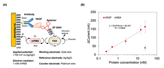 To this end, we present a novel GDH labeling method using ZF-fused GDH for aptamers. As a proof of concept, we have utilized vascular endothelial growth factor (VEGF) as a model target. VEGF plays an important role in the formation of new blood vessels of tissues [26]. As anti-VEGF pharmaceuticals are being used in tumor and age-related macular degeneration therapies, the detection of VEGF is important to predict the effectiveness of these treatments [27,28,29]. Moreover, VEGF is suggested as a biomarker for the early diagnosis of several diseases, such as lymphangioleiomyomatosis [30], major depressive disorder [31], and diabetic nephropathy [32]. Therefore, the rapid and sensitive detection of VEGF levels is crucial for clinical purposes. Here, we present the construction and results of an electrochemical sensor based on a GDH-labeled aptamer for VEGF detection with a lower detection limit of 105 pM.