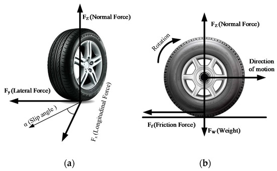 The tire model can be divided into three types: theoretical model, empirical model, and semi-empirical model. Each model contains a variety of specific tire models. The tire model used in this paper is the Pacejka model, also known as the magic formula tire model (MFTM), which is a model based on the longitudinal force, lateral force, and aligning torque of a tire [25] and is widely used in research.