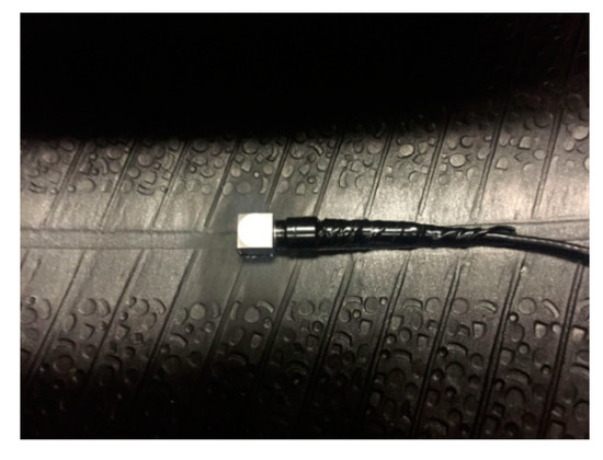 The tire tread sensor, embedded on the surface of the inner tire, is used to monitor the interaction between the tire and the road surface, and to estimate the friction characteristics between them. The main types are piezoelectric, acoustic surface, and optical sensors. A tri-axial accelerometer tread sensor is shown in Figure 7. Arto [17] used three three-axis accelerometers as tire sensors to estimate friction based on acceleration signals. Zhang, et al. [18] installed passive wireless acoustic surface sensors inside the tires to achieve the function of automatically measuring tire pressure and temperature parameters. Pohl, et al. [19] estimated the tire–road friction coefficient based on the strain of the tread element. Tuononen, et al. [20] developed a tire sensor based on optical position detection. It can measure the deflection of the carcass relative to the rim, which can be used to calculate the tire force (vertical force and lateral force) and to estimate the friction coefficient. Both Yi [21] and Erdogan [22] measured the parameters related to friction through the tread sensor.