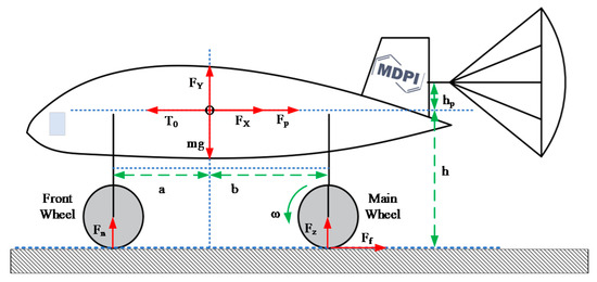 Two kinds of aircraft ground kinematics equations were established. One was to simplify the aircraft motion to a linear motion model with a single wheel and a part of the aircraft mass [32,33]. The other was to consider the force of the aircraft in the taxiing process and regarded other secondary factors as disturbances to the system [34,35]. Force analysis of aircraft taxiing is shown in Figure 8, and the meanings of these symbols shown in Figure 8 are given in Appendix A. In establishing the aircraft ground kinematics equations, some assumptions are made, Fu [34] describes them in detail. The aircraft longitudinal motion equation (Equation (8)), aircraft vertical force balance equation (Equation (9)), torque balance equation (Equation (10)), and braking wheel dynamics equation (Equation (11)), were established.