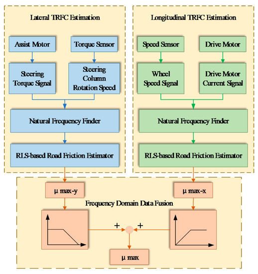 Right now, multi-sensor information fusion technology is widely used in various fields, meanwhile, it has also made a great contribution to the friction coefficient measurement. For example, IVSS [12] proposed a combination of the force-based and indirect optical methods. The longitudinal force was obtained when accelerating or braking, and the lateral force was obtained when turning. Considering these two force-based algorithms as independent, using a third fusion algorithm will improve the friction estimation performance and usability. For improving the tire–road friction coefficient estimation, Bin, et al. [38] used an adaptive extended Kalman filter based on finite memory, and Liu, et al. [39] used the combination of an auxiliary particle filter and iterative extended Kalman filter. The tire–road friction coefficient estimation based on frequency domain data fusion was proposed by Chen, et al. [40], and its fusion process is given in Figure 13.