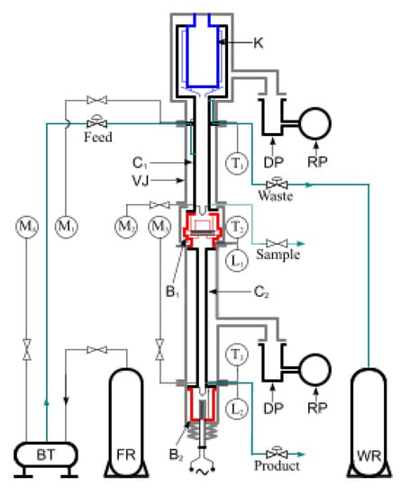 The internal flows of gaseous and liquid phases—the column loads—are generated by thermal effect. The electrically heated boiler (B), from the column basis, generates by evaporation the gaseous ascendant phase in the column, while the condenser (K) from the top side of the column, cooled by liquid nitrogen, Figure 2, converts the gaseous phase to a liquid phase downstream. In order to increase the contact surface between gas and liquid, in column is fixed a special packing material [20,21].