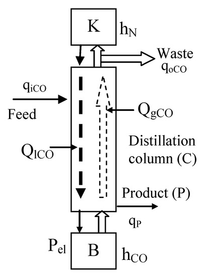 During the normal operation, the column is supplied with gaseous carbon monoxide at the in-flow (qiCO) and the waste is evacuated by the flow (qoCO).