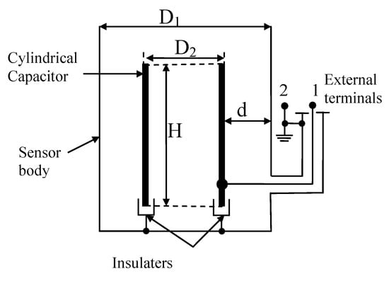 Although many versions of liquid-level sensors are available [24,25,27,28], the constructive particularities of the separation column impose particularized sensors. The place, shape and dimension of the liquid carbon monoxide-level sensor is an important element embedded in the isotope-separation column design. The authors propose the use of a capacitive sensor—based on the difference between the liquid (εl) and gaseous (εg) permittivity coefficients. It is a cylindrical capacitor embedded in the boiler (column body), with the height (H) and the external/internal diameters (D1/D2). This sensor is schematically presented in Figure 3.