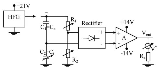 The output (useful) signal of the transducer is generated by the electronic adapter, Figure 4, where a high-frequency generator (HFG) (f ~300 kHz) supplies a mixed (R/R) and (C/C) bridge. In the (RC) bridge, (C1) is a reference capacitor and (C2 = CΣ) is the transducer total variable capacitance. The variable resistors (R1, R2) are used to calibrate the measuring bridge. The bridge unbalance is rectified and amplified by an operational amplifier.