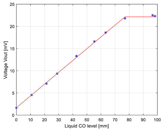 In Figure 5 are presented the experimental, measured results of the level transducer (marked with stars)—in the range of 0–78 mm of the CO liquid level—compared with the results given by the Equation (10), solid line. It is observed a good linearity, with the norm of residuals of 0.62685 and the R-square equal to 0.99, computed in MatlabTM. Outside this range, the transducer is saturated, but the present application do not need other values.