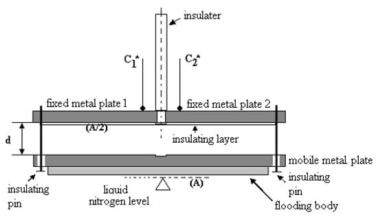 the capacity changes with the nitrogen level evolution due to the variation of both parameters: permittivity and distance (d). Since the permittivity ratio in the case of isotope separation is , the capacity variation with the nitrogen level is relatively small. For the proposed sensor also changes the distance (d) between capacitor plates with the nitrogen level, which generates much more variation of the sensor capacity. In accord to Figure 6, the distance (d) varies in the domain 0.5–6 (mm). The plates of nonlinear transducers for the liquid nitrogen level in the condenser are made of typical one-side plates for printed electronic circuits. The electrical connections are achieved of copper with Teflon insulation. The sensor support is made of insulated carbon fiber bare.