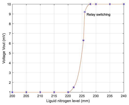 The corresponding electrical circuit is similar with the circuit presented in Figure 4, with the difference of the final element, which is now an electromechanical relay used to control the electromagnetic valve. The output voltage is the voltage over the relay coil. The relay contacts switch at a voltage of about Vout = 8 V. Unlike the usual CO-level sensor in the boiler which must exhibit a good linearity, the liquid nitrogen sensor has a nonlinear characteristic, typical for accurate level control systems. In Figure 7 is presented with solid line the theoretical dependence between output voltage over the relay coil and the liquid nitrogen level, while the stars represent the experimental data, exhibiting good accuracy. The corresponding mean squared error is 0.012.
