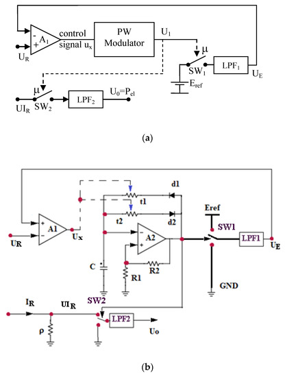 In the separation process it is recommended a DC power supply for the boiler resistor in order to avoid the electromagnetic interferences (EMI). The proposed transducer is based on the pulse–width-modulator (PWM) principle, implemented with optocouplers as variable resistors, in closed loop, as it is schematically presented in Figure 8a. Due to the variations of the heating element resistance, the power value is obtained using the product (Pe = UR∙IR), where (UR) is the voltage, (IR) is the current related to the heating resistor and (Pe) is a power proportional with (Pel). The current (IR) is sensed by a usual shunt (ρ) [32], which gives a voltage (UIR) proportional to the current (IR).