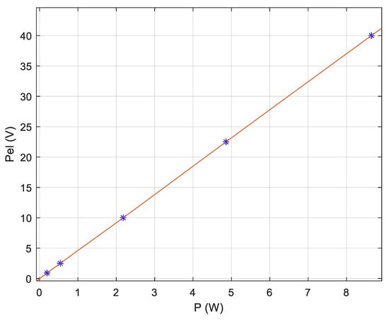 The static diagram of the electrical power sensor is given in Figure 9. Based on the well-known “volt–amperometric method” [31], with high precision voltmeter and ammeter (class 0.2) were measured: the voltages (UR), (UIR) and (U0) and the current (IR). The theoretic characteristic computed using the equation , is represented with solid line in Figure 9. With stars are represented some measured output values of the power transducer. The maximum error was observed by the superior range limit, where the computed value is 8.75 V, the measured value is 8.65 V, resulting the absolute error of 0.1 V and the relative error of 1.14%. For the isotope-separation column operation, it is considered a good transducer quality [20].