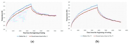 Surface temperature development: (a) BM 2–2–thermal excitation distance 2 m, top side, defect No. 2; (b) BM 3–2–thermal excitation distance 2 m, top side, defect No. 5.