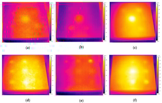 Optimal thermograms acquired for different concrete qualities: (a) BM 1–1 (topt = 170 s); (b) BM 2–1 (topt = 170 s); (c) BM 3–1 (topt = 100 s)—thermal excitation distance 2 m, bottom side and (d) BM 1–2 (topt = 120 s); (e) BM 2–2 (topt = 50 s); (f) BM 3–2 (topt = 50 s)—thermal excitation distance 2 m, top side.