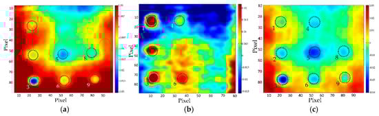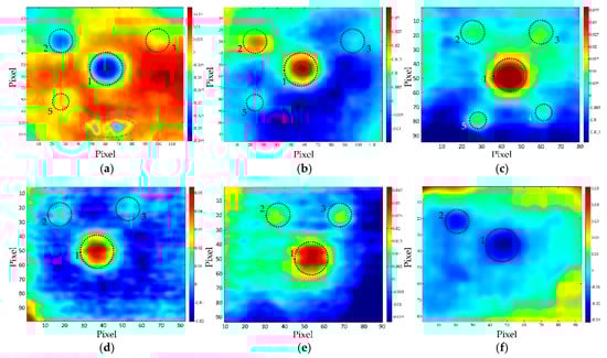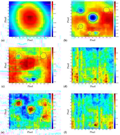 It can be seen that EOF1 is quite similar to the thermogram taken at the moment of turning off thermal excitation (Figure 7a) and can be said that it captured a lot of background information like non-uniform heating. On the other hand, EOF2 (Figure 7b) and EOF5 (Figure 7e) indicate that there are four and five defects, respectively, embedded in the concrete sample.