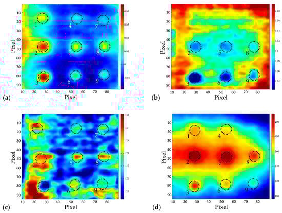 Comparison of results gained using two post-processing methods, BM 3–2, distance 2 m, top side: (a) PCT; (b) Phasegram (); (c) Phasegram (; (d) Ampligram (.
