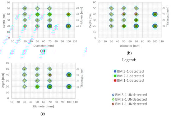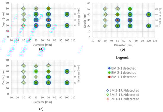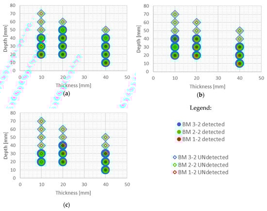Possibility of defect detection overview for samples BM x-1 (all three concrete types) using PCT: (a) excitation distance 1.5 m; (b) excitation distance 2 m; (c) excitation distance 3 m.