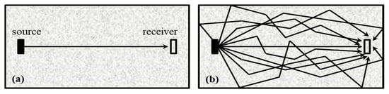 Principle of ultrasonic transmission measurements and propagation paths for (a) a direct wave and (b) a coda wave.