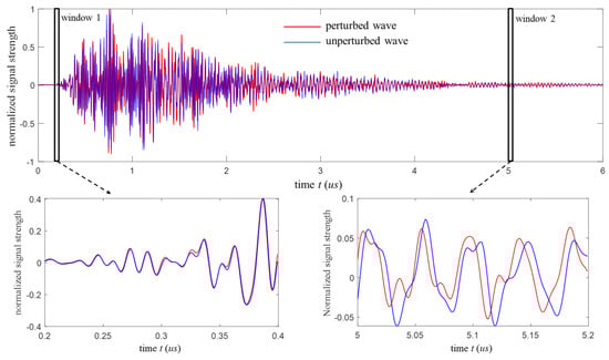 In a summary, coda wave has traveled a large volume for a long time so that small changes anywhere in media result in a notable absolute time lag, which makes it ideal for NDT&E applications. Figure 3 shows the great sensitivity of coda waves following a medium change as an example. The blue curve represents the unperturbed wave, and the red curve represents the perturbed wave under a small load. Coda waves at the late part of the signal (window 2) show obvious phase changes, whereas the direct waveforms in the single scattering regime (window 1) are nearly invariable.