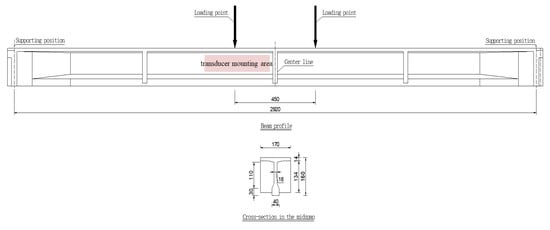 The T-beam is 30 m in length and 1.6 m in height. Its widths at the top and bottom surfaces are 1.7 and 0.4 m, respectively. Figure 4 shows the detailed dimensions. During the service period, the T-beam has experienced a large amount of mechanical loads, corrosions, and environmental effects, and it can well represent plenty of in-service large concrete structures in the real world.