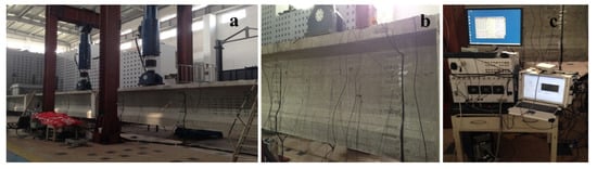 Figure 6 shows the four-point bending test conducted on the T-beam. Two hydraulic jacks were placed symmetrically close to the mid-span, and the distance between them is 450 cm. The loads of each jack were increased from 0 to 50 kN with a fixed step of 10 kN.