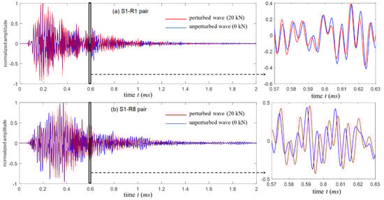 Figure 7 shows the average waveforms corresponding to the S1-R1 and S1-R8 pair measurements at 0 kN and 20 kN loads. Similar to Figure 3, a part of the waveforms is enlarged to denote the details of their variations caused by the load. For the S1-R1 pair, the time compression is found in the waveform at 20 kN relative to its reference waveform, which implies compression forces play a major role in this region. In contrast, the clear time dilation is observed in the S1-R8 waveforms indicating tension effects.