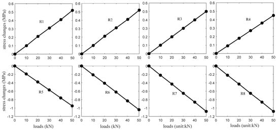Figure 8 shows the structural analysis values of the stress changes at the receivers R1∼R8 positions. A finite element model was established to obtain the results where a linear elastic stress-strain relationship was adopted for the analysis. The modeling results also agree well with the results calculated with the classic stress-bending moment equation. For R1∼R4 placed in the upper portion of the T-beam, their locations experience the changing compressive stresses that increase linearly with the loads. On the other hand, the changing tensile stresses, appearing at the R5∼R8 positions of the lower portion, also linearly increase as the loads increase.