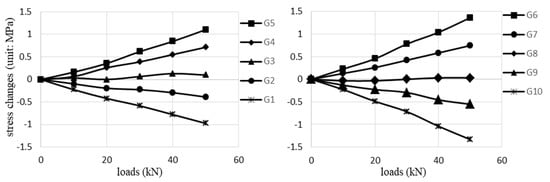 The stress changing values measured with the G1∼G10 strain gauges are illustrated in Figure 9, which are in basic agreement with the analysis results. For the G1, G2, G9, and G10 gauges placed in the lower portion, their stress changes decrease almost linearly as the loads increase. At the same time, the stress changes at the G4∼G7 positions increase. The stress changes at the G3 and G8 positions are close to 0, which implies the neutral axis is located near them.