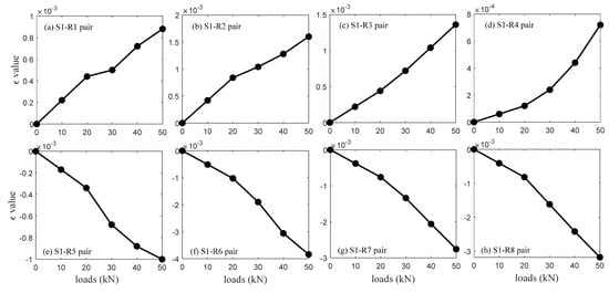 Figure 10 presents the ε calculation values corresponding to the source S1 excitation. They show the same trend with the analysis results depicted in Figure 8, i.e., the ε values of R1∼R4 and R5∼R8 increase and decrease approximately linearly with the loads. These results prove that ε values (i.e., coda waveforms) can well recognize compression and tension stress changes in concrete. The ε results from the source S2∼S6 excitations are also in accord with this trend, and they are not shown in this case for the sake of simplicity.