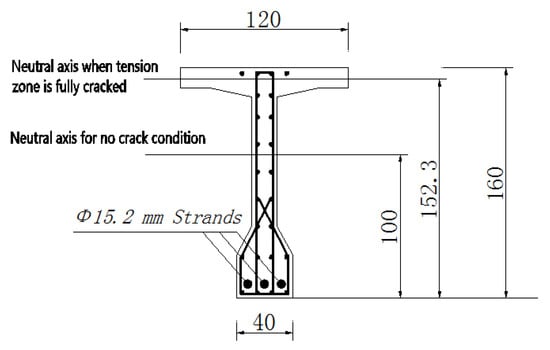 Based on the elastic beam theory, the neutral axis position corresponds to the reinforcements, pre-stresses strands, and concrete composite. It could be located by transforming the steel area in uncracked concrete into an equivalent concrete area [30]. Note that the concept of neutral axis in this paper refers to zero stress/strain change under applied load, which is not the absolute zero stress/strain location. The structural analysis shows the neutral axis in intact cross-section is located at the height of 100 cm from the bottom. When the cracks are fully developed in the tension zone and concrete completely lose its ability to resist tension forces, the neutral axis will move up to the height of 152.3 cm. As shown in Figure 11, the theory height of the neutral axis between the intact and fully cracked conditions range from 100 to 152.2 cm.