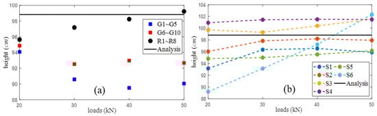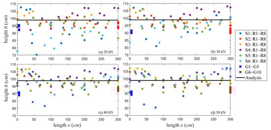 Then, for all available transducers at the upper (R1∼R4) and lower (R5∼R8) portions of the T-beam, lines connecting them are utilized to locate the coordinates of the stress invariant (ε = 0) through the linear intercepts of the ε diagrams. There are 4 × 4 receiver pairs for each of six source excitations, which implies 96 coordinates of the neutral axis locations can be determined at each loading step. Figure 12a and Figure 13a illustrate their location distributions and the mean heights under different loads where the localization results from gauge measurements and structural analysis are also denoted.