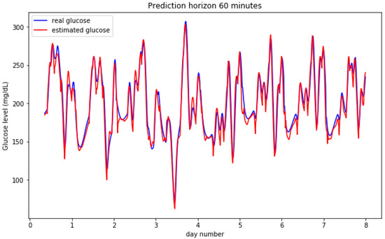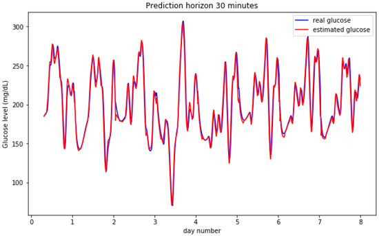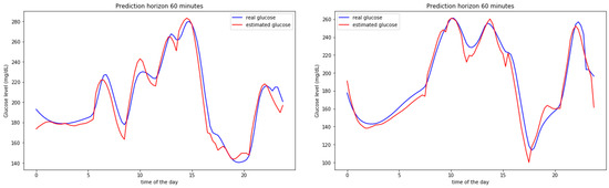 Figure 2 and Figure 3 show the result for the estimated blood glucose levels for both 30 and 60 min horizons. The results for a 60 min horizon are a bit worse and bigger differences can be visually assessed per the relative maxima and minima values, however, both cases generate a low error RMSE figure.